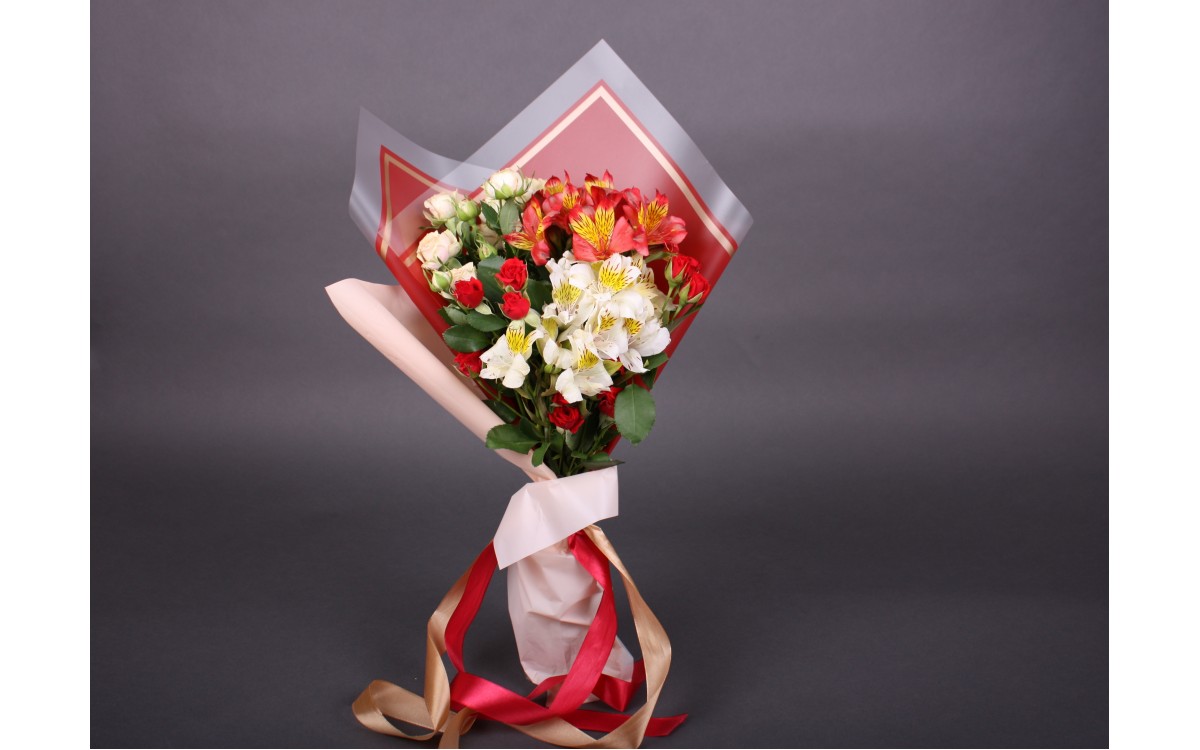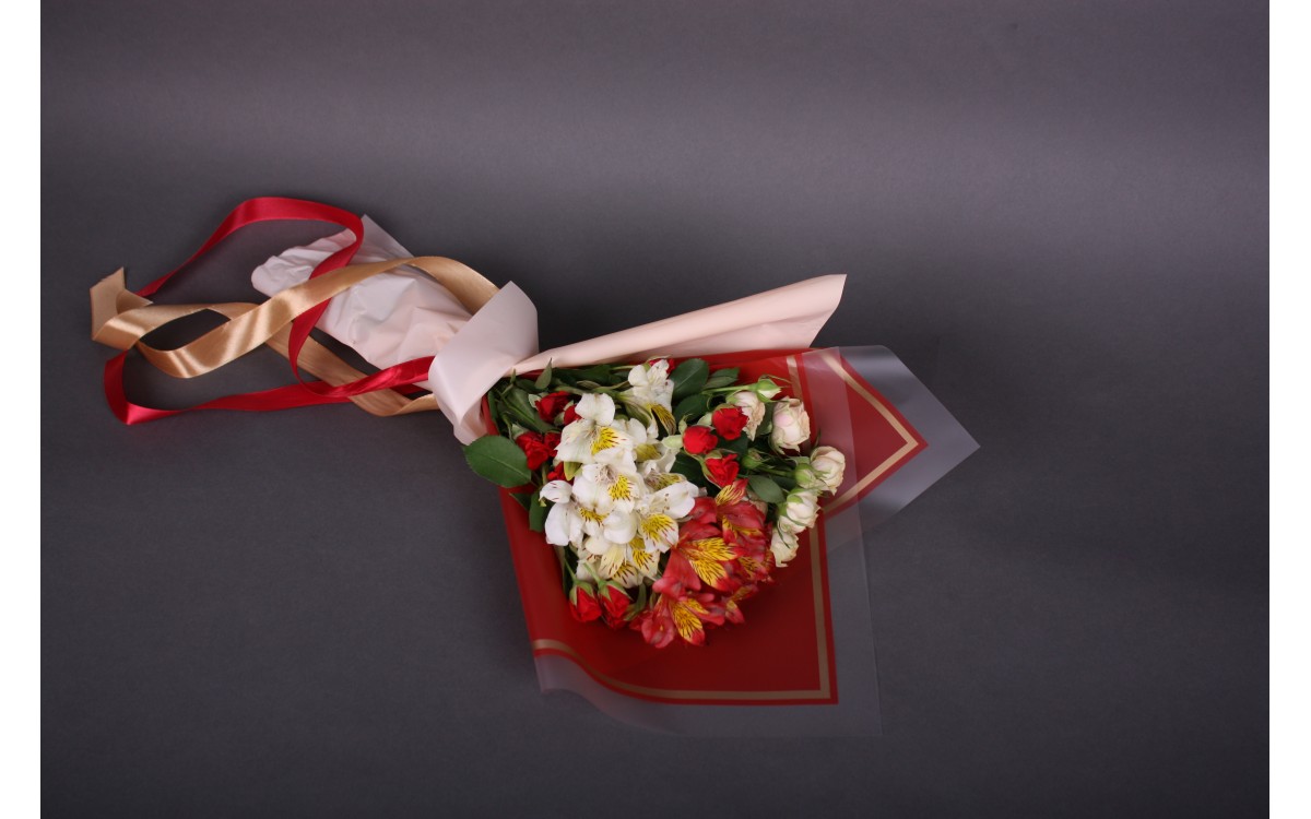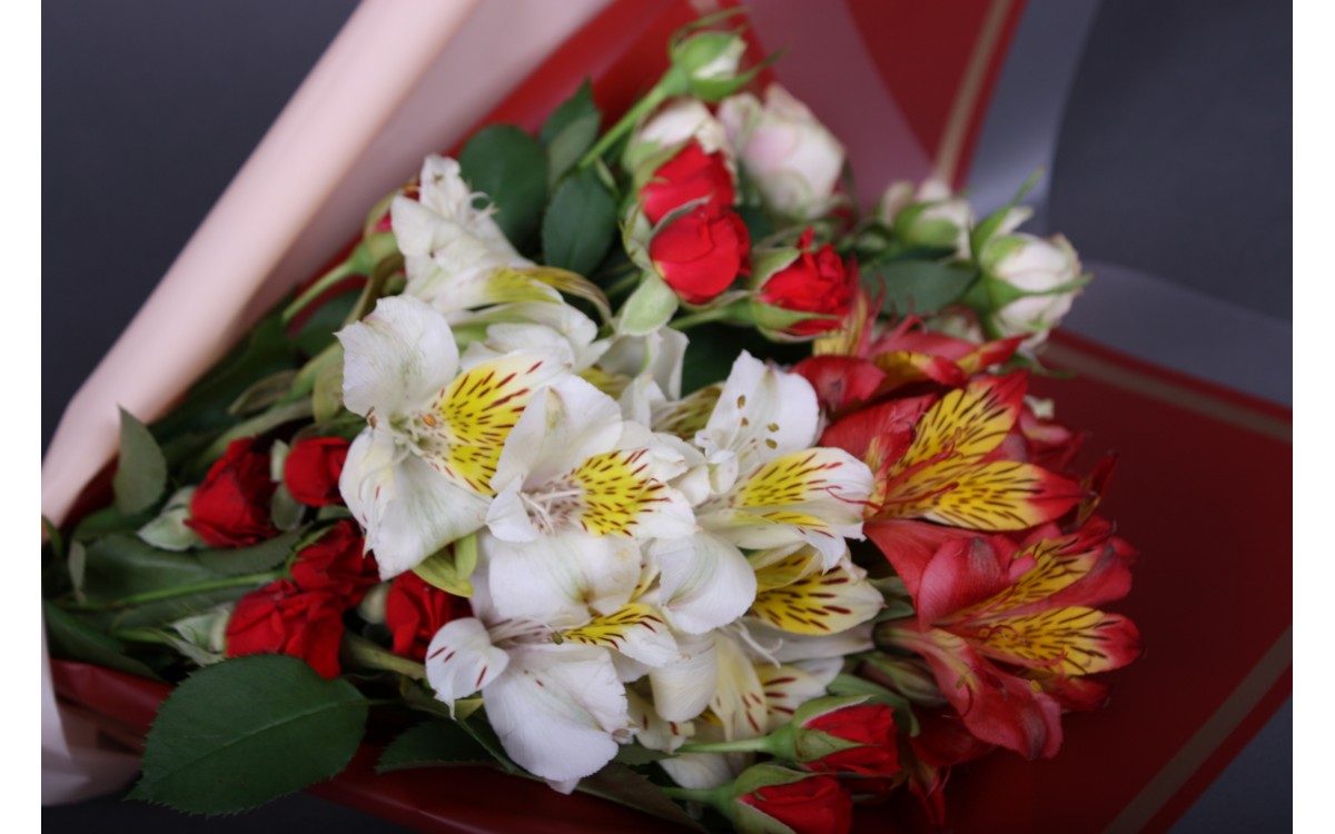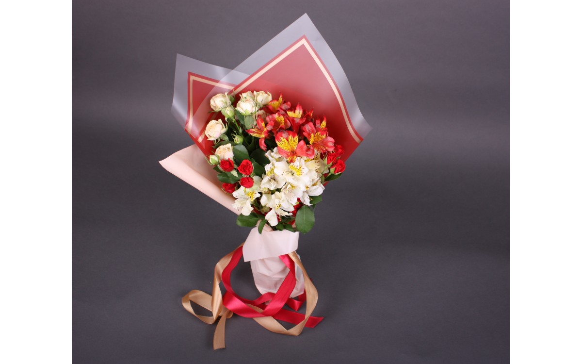 6 різнокольорових альстромерій, 5 кущових троянд, упаковка.