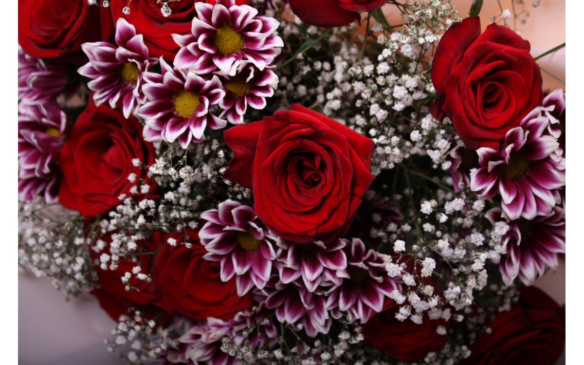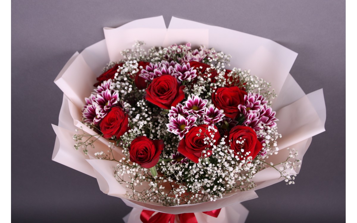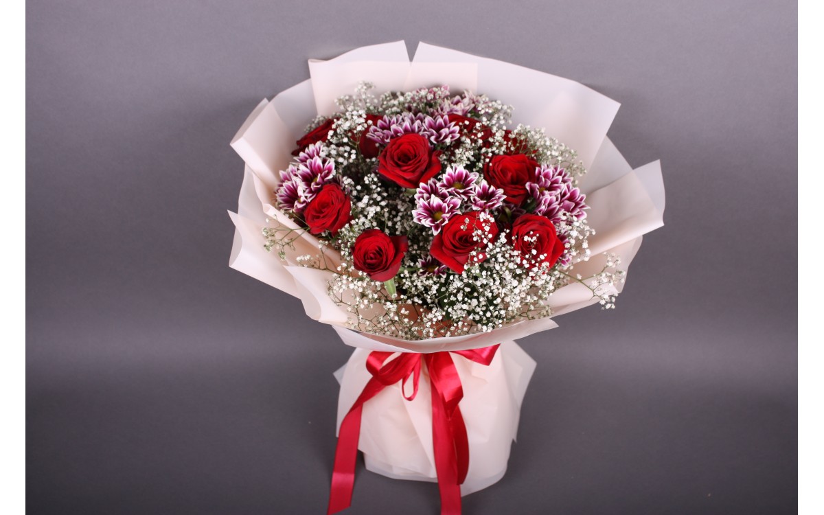 15 червоних троянд, 11 гіпсофіл, 5 хризантем, упаковка, стрічка.